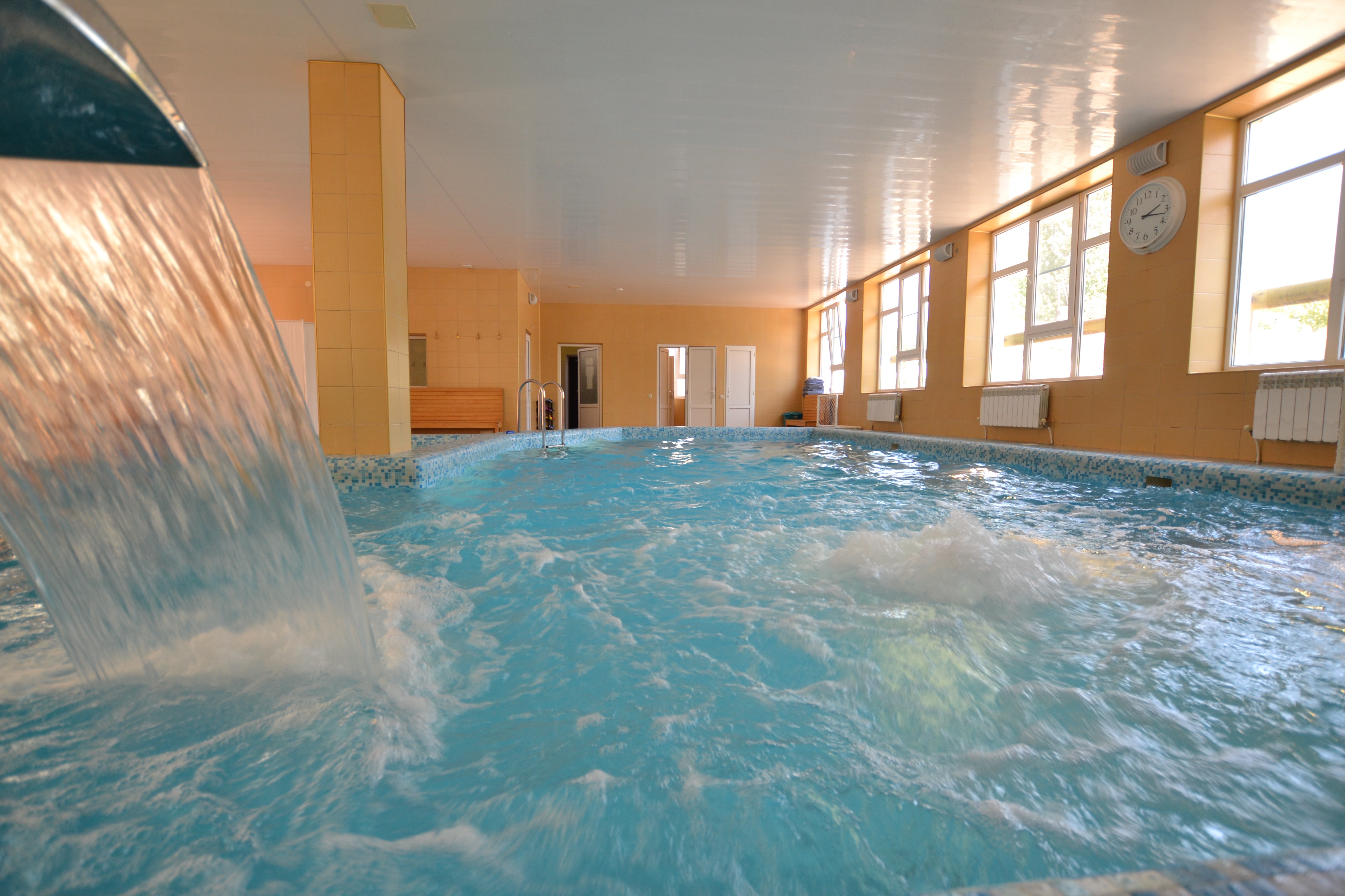 - крытый подогреваемый бассейн с водопадом, гейзером и системой противотока,